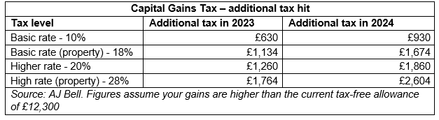 If you realised that same amount of gains from investments from 6 April onwards you’ll face an extra tax bill of £1,260 for a higher-rate taxpayer, or £630 for a basic-rate taxpayer. And if you factor in April 2024’s changes, when the CGT allowance will halve again to just £3,000, those figures rise to £1,860 and £930 respectively.